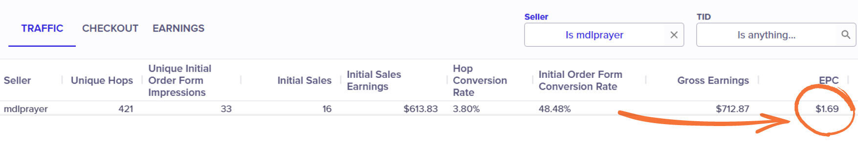 What you’re seeing right here, are actual results from an affiliate promoting our program, Rose Grail Prayer. With nearly a 4% conversion rate on over 400 hops, earning a massive $1.69 per click!